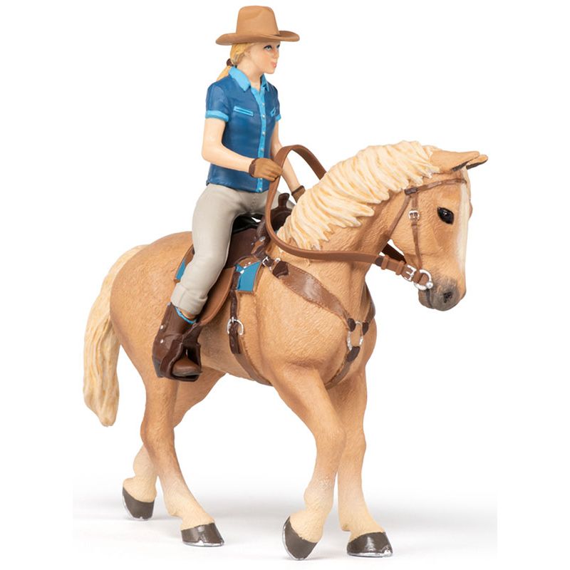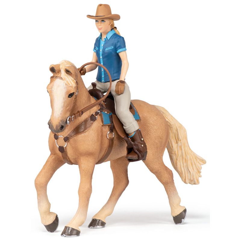 Papo Quarterhäst med cowboy tjej. Quarterhäst är den mest använda hästen i USA och den ras som finns i störst antal över hela världen med ca 3 miljoner registrerade exemplar. Längd: 16 cm.