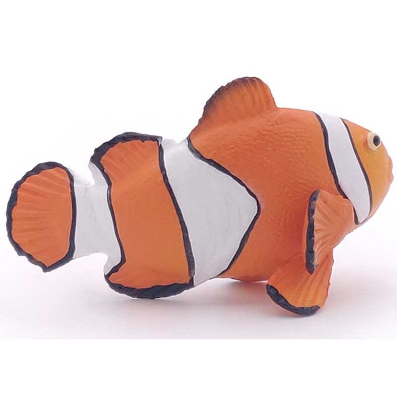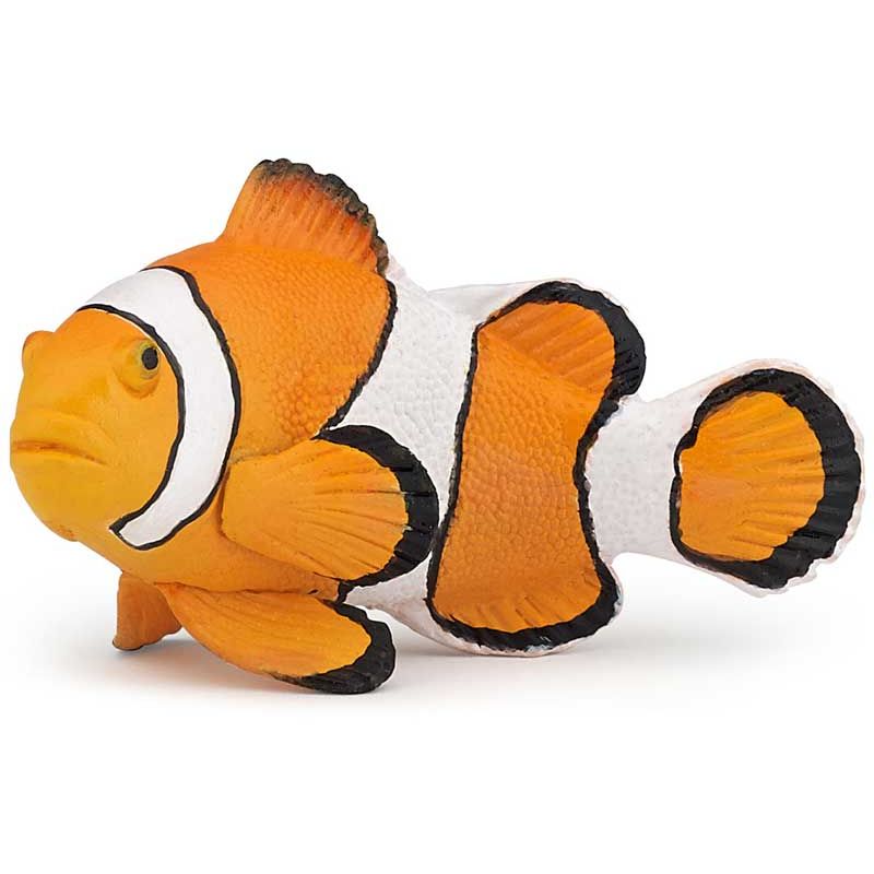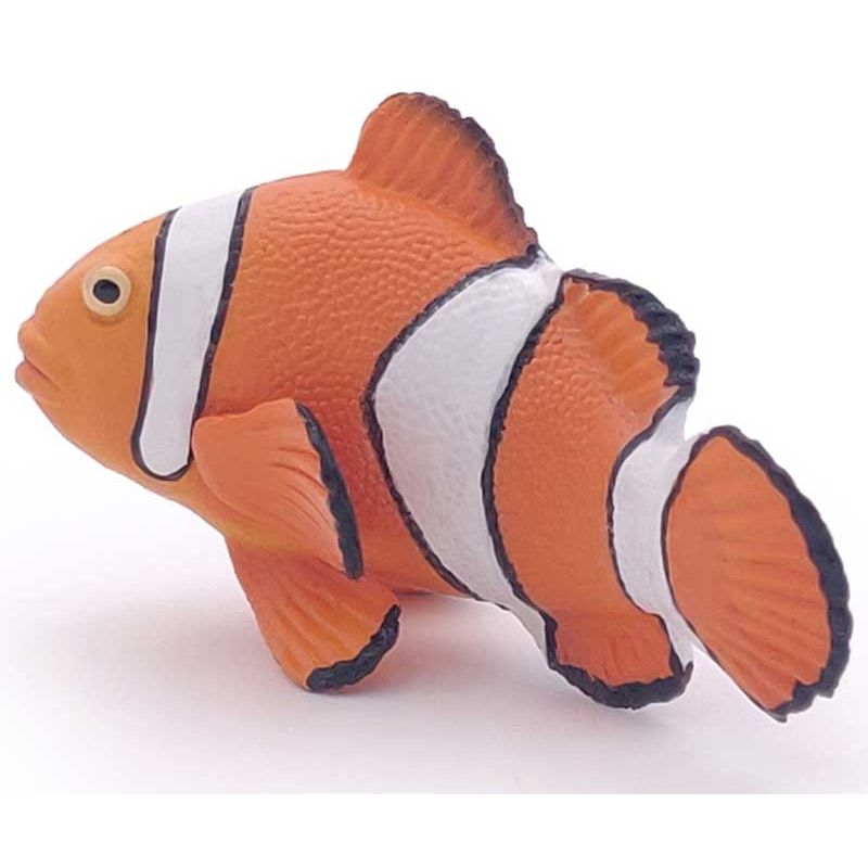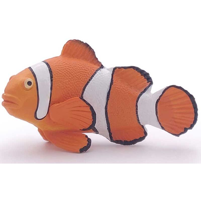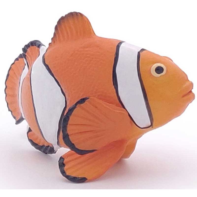 Papo Clownfisk. Clownfisken förekommer i korallrev i västra Stilla havet och östra Indiska oceanen. De är mycket färgglada fiskar och de flesta blir omkring 10 cm långa. Längd: 6 cm. Utgått, se andra leksaksdjur, klicka här.