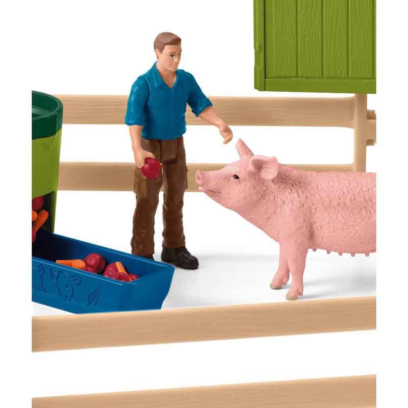 Schleich Bondgård Stor med bondgårdsdjur 42605. Bonden Paul har alltid händerna fulla. Grisarna grymtar ljudligt och vill bli matade och kon i ladan ser redan ganska hungrig ut.