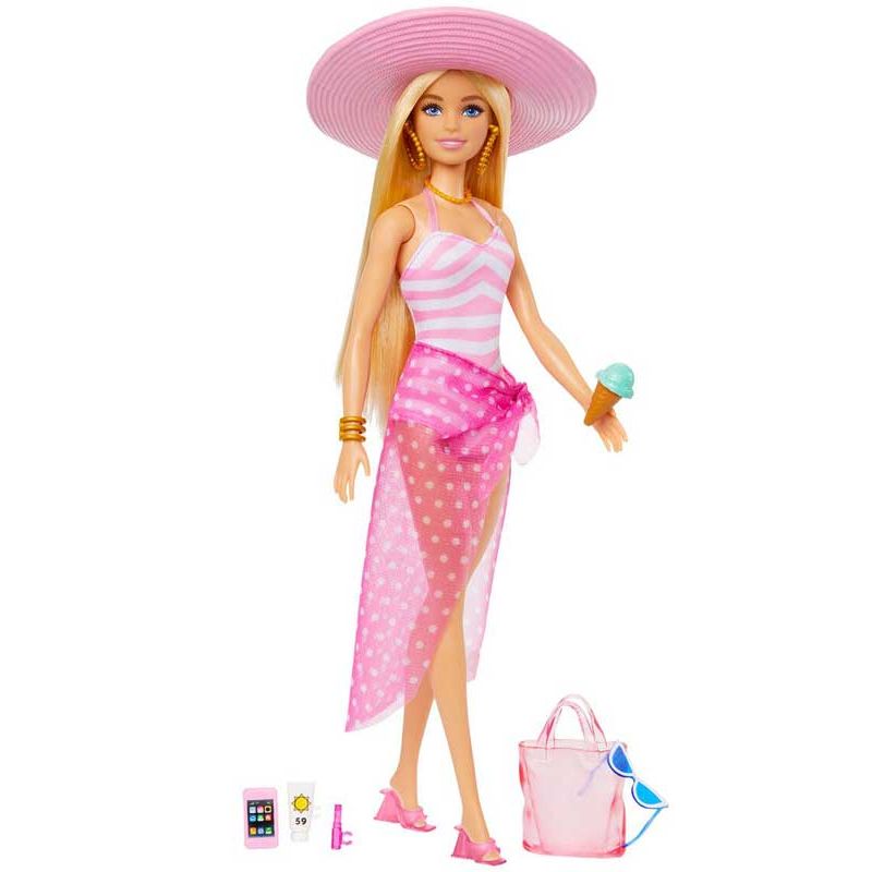Barbie Beach Day Stranddag . Med tårna i sanden och en glass i handen har den här blonda Barbie-dockan allt som behövs för en avkopplande dag i Malibu! Det ingår 1 st docka, solhatt, baddräkt, saring, skor, glass, solglasögon, smycken, solkräm, mobiltelefon, läpsstift mm. Utgått, se andra barbiedockor, klicka här.