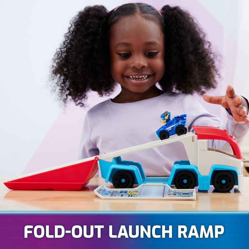 Den har en spännande förvandling från en PAW Patroller-lastbil till en fantastisk mobil kommandocentral, komplett med startramp och förvaringsutrymme för leksaker för ytterligare Pup Squad-racerbilar (säljs separat)!