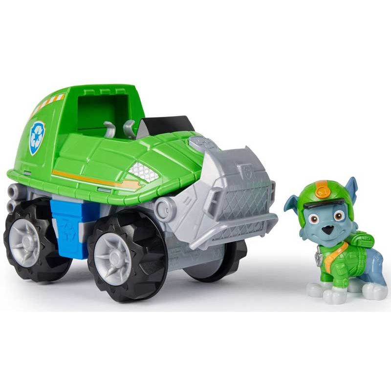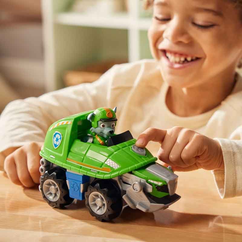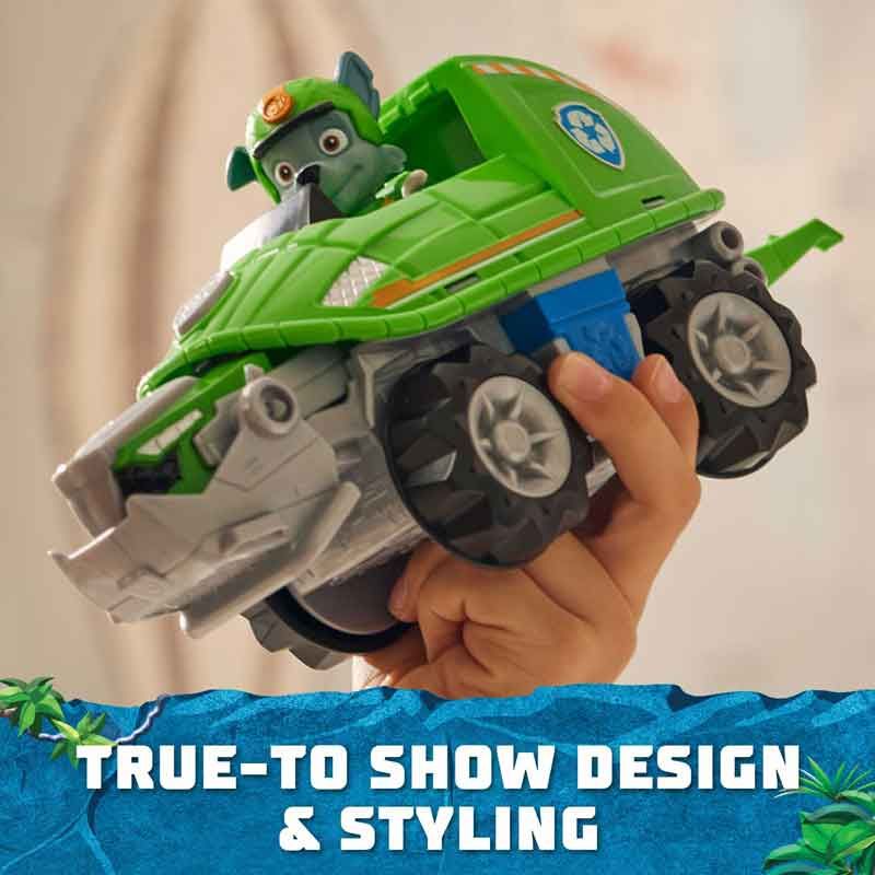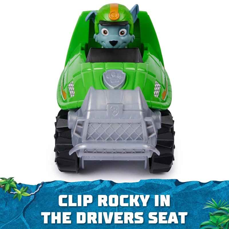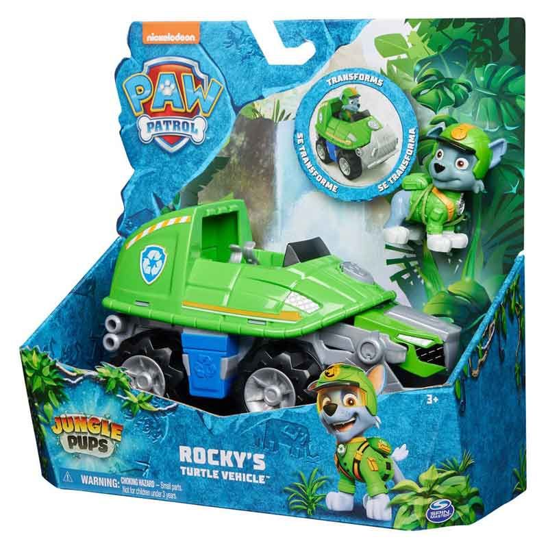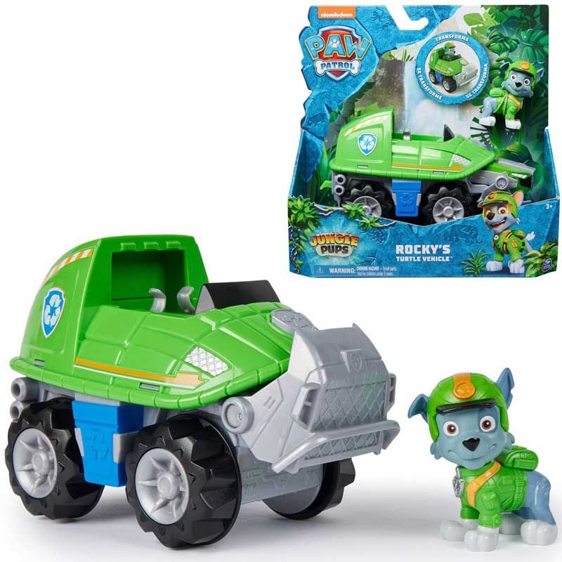 Paw Patrol Jungle Themed Vehicle - Rocky. Rockys fordon har en spännande transformering till räddningsläge genom att trycka ner främre delen av hans fordon för att exponera sköldpaddans näbb och sedan dra ut svansen från fordonets bakdel innan du öppnar sköldpaddans mun och fullföljer transformeringen.