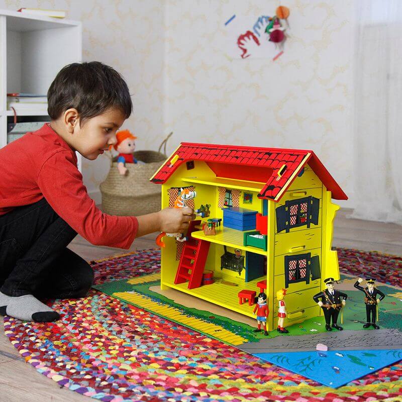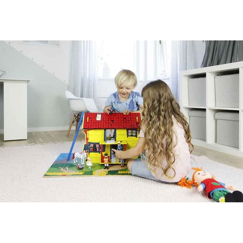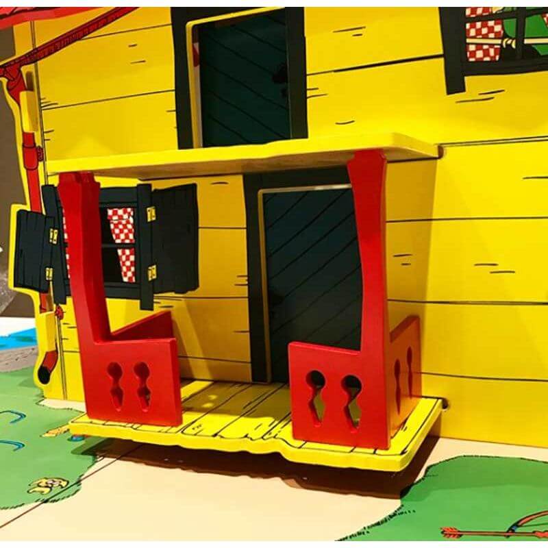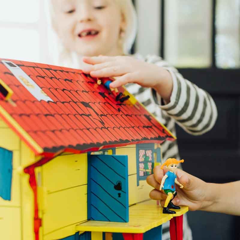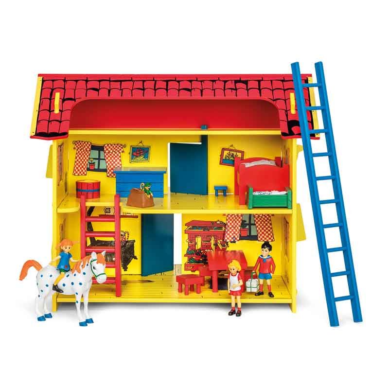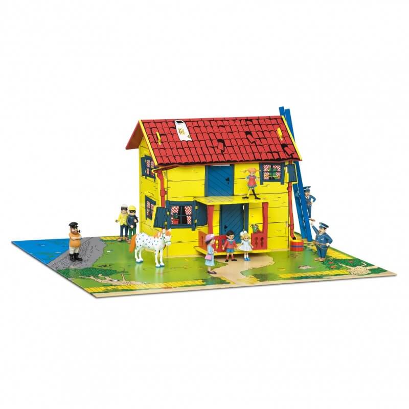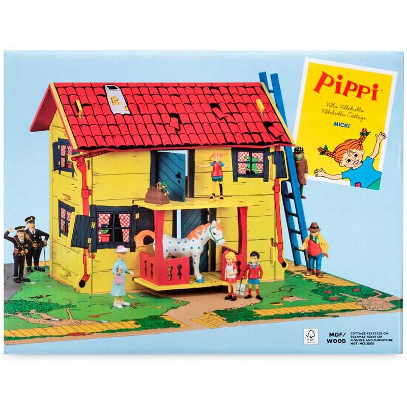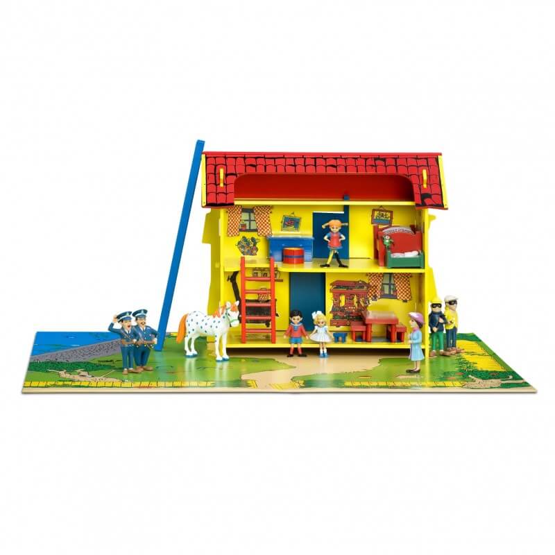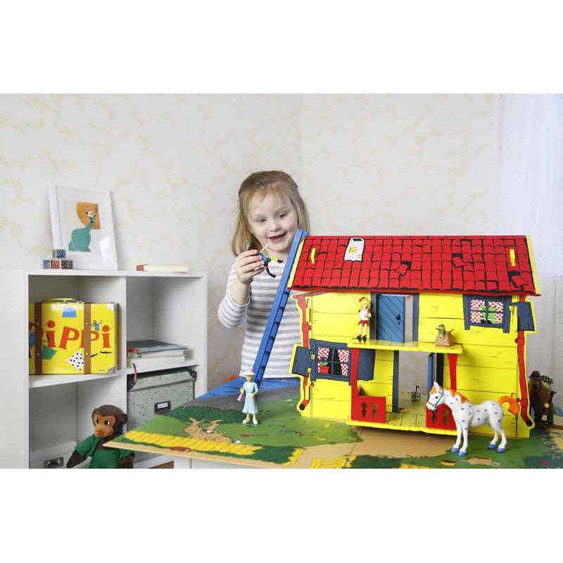 Setet innehåller ett inspirerande leksakshus som är lätt att plocka ihop och isär. I huset ingår innertrappa, stege och en lekplatta i papp som föreställer Pippis trädgård.
