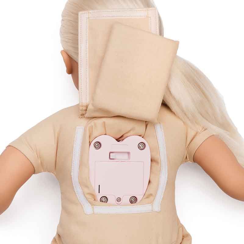 Hon talar 5 olika språk; svenska, norska, danska, finska och engelska. Byt enkelt språk på det hjärtformade talverket i dockans rygg.