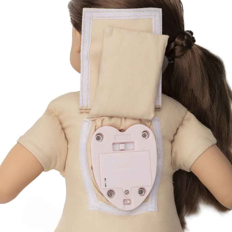 Hon talar 5 olika språk; svenska, norska, danska, finska och engelska. Byt enkelt språk på det hjärtformade talverket i dockans rygg.
