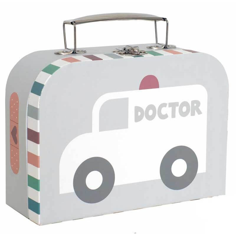 Jabadabado Doktorsväska silver grå , en superfin grå doktorsväska i hård papp med hela 9 roliga tillbehör och doktorsredskap i trä.