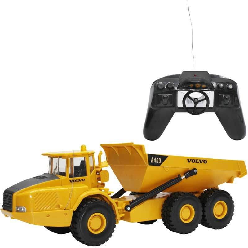 Radiostyrd Dumper Volvo A40D från märket NewRay, en jättefin dumper som man enkelt kan styra med en handkontroll. Lasta på grus med en grävmaskin eller hjullastare och häll i dumpern. Man kan så klart lasta grus med handen också :-). Kör sedan iväg gruset med dumpern och tippa av lasset. Skala 1:32. Längd: 35 cm.