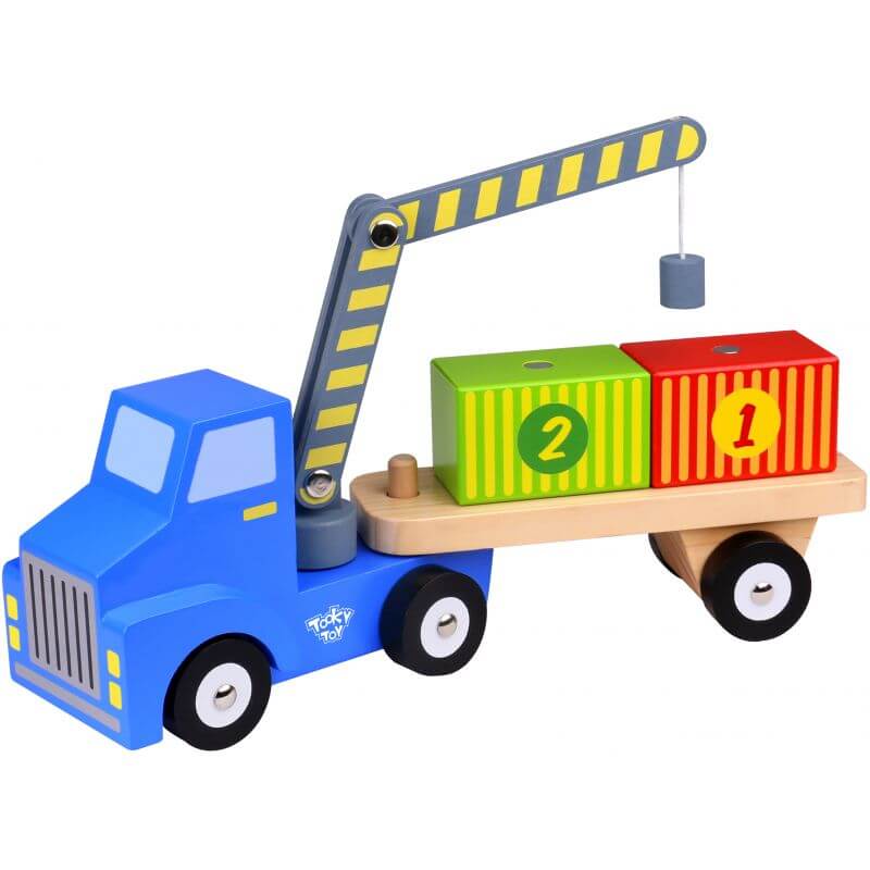 Tooky Toy Lastbil med container och magnetkran består av en blå lastbil med flak som går att koppla av om man vill och en rörlig kran, längst ut på kranen sitter en magnet som kan lyfta de två medföljande containrarna. De är också numrerade med 1 och 2 så att barnet kan ta sina första stek till att lära sig räkna. Containrarna sitter säkert kvar på flaket med hjälp av träpiggar som ser till att lasten inte trillar av och flaket kan man dessutom koppla av så att man kan köra runt med bara lastbilen om man vill det