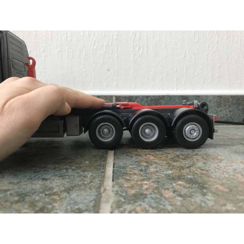 Emek Volvo leksakslastbil FH16 750 med Tridem lastväxlare och släp. Snygga röda släp som rymmer mycket grus, jord eller annat material.