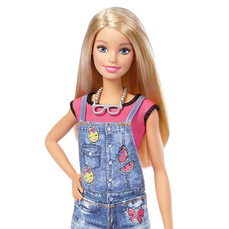 Barbie D.I.Y. Emoji Style Mattel DYN93. Här kommer ett fint lekset där man kan designa sin egna kläder. Man kan fästa olika fina klistermärken på medföljande kläder, eller varför inte på andra Barbiekläder också. Höjd: 27 cm.