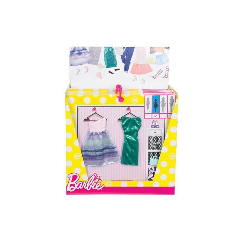 Barbie Fashion Klänningar 2-pack. Två festliga klänningar till Barbiedockor. Vackra färger och snygg design. Med i paketet medföljer också två galgar att hänga klänningarna på.