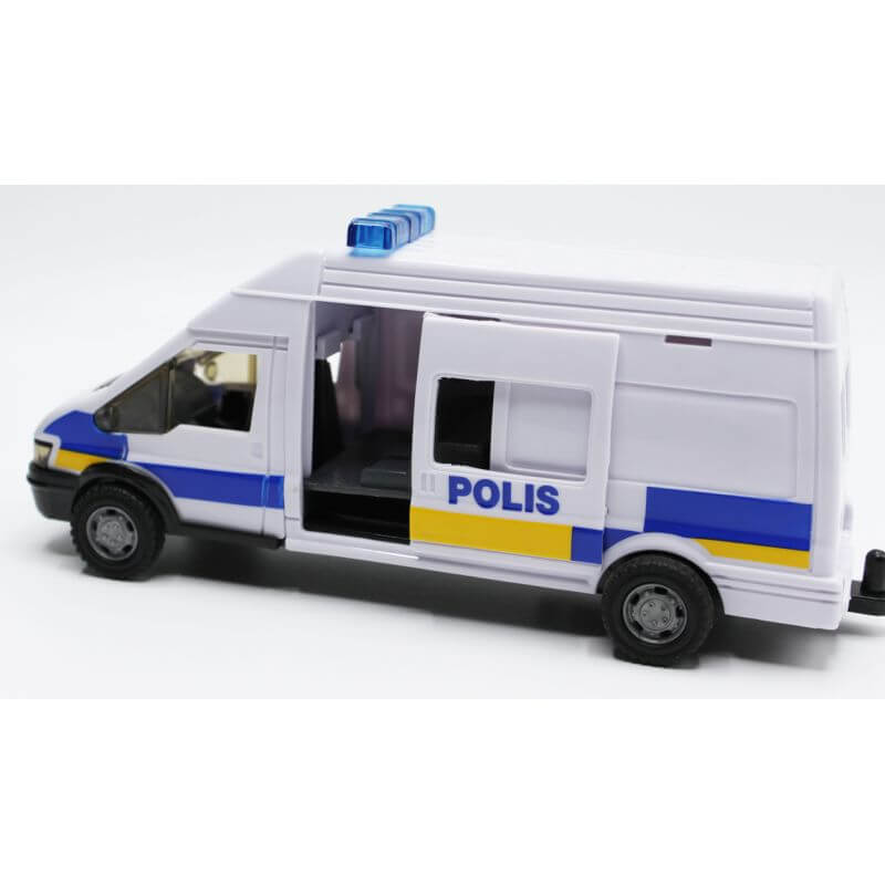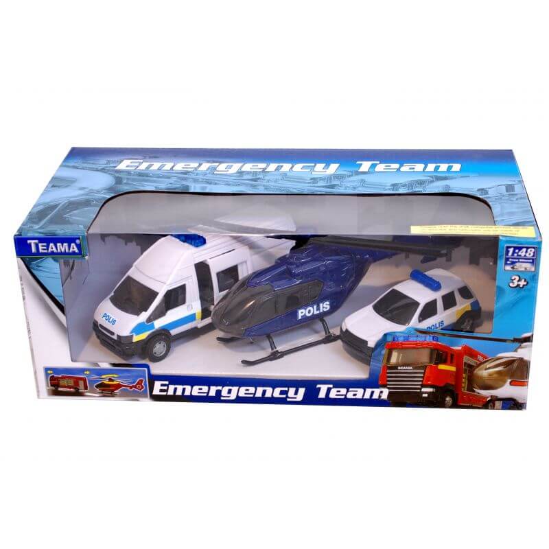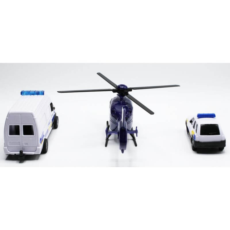 Leksaksfordon i form av polisfordon, ett härligt lekset till barn. Här får man en hel polisstyrka med polisbuss, helikopter och en fin polisbil. Polisbussens dörr på sidan är öppningsbar och helikopterns propeller kan man snurra runt. Den stora polisbussen kan dessutom åka framåt om man drar den bakåt och sedan släpper. Nu ska det fångas tjuvar! Skala: 1:48