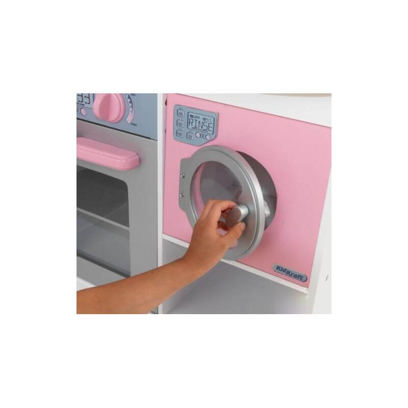 Köket innehåller både kyl och frys, ugn, mikrovågsugn, spis, diskho och tvättmaskin. Allt med öppningsbara dörrar och massor av roliga knappar och vridbara reglage. Det finns även en griffeltavla på frysen.