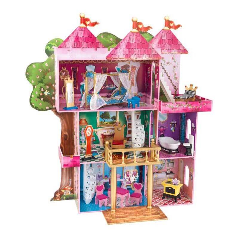 KidKraft Dockskåp Story Book Mansion, detta vackra och stora dockhus ser ut som det kommer direkt från en saga, med rosa torn och en häftig bakgrund i form av ett stort träd. Det finns tre våningar, fem rum och två mysiga balkonger, en lite mindre och en större med plats för möbler. Dessutom ingår en häftig stor flyttbar entré med guldiga pelare som skapar en balkong till andra våningen.