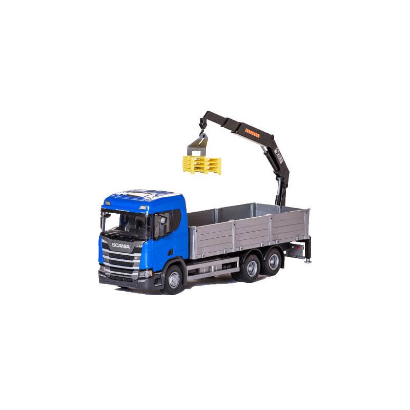 Emek Scania R 500 Next Generation med blå hytt Kranbil med pallar, en superfin lastbil till barnens lekrum. Här får man en snygg leksakslastbil, med palllyft och pallar.