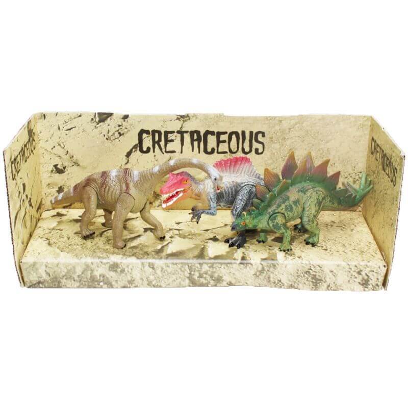 Ett superroligt paket för barnen att leka med som innehåller hela tre häftiga dinosaurier. Alla dinosaurier är väldigt olika varandra för en mer varierad lek, vissa flyger, vissa jagar och andra äter växter och träd och tar det mest lugnt. Tyrannosaurus Rex kan man röra käken på och bakbenen är rörliga. Vingarna på Pterodactyl är rörliga. Triceratops har rörliga ben.