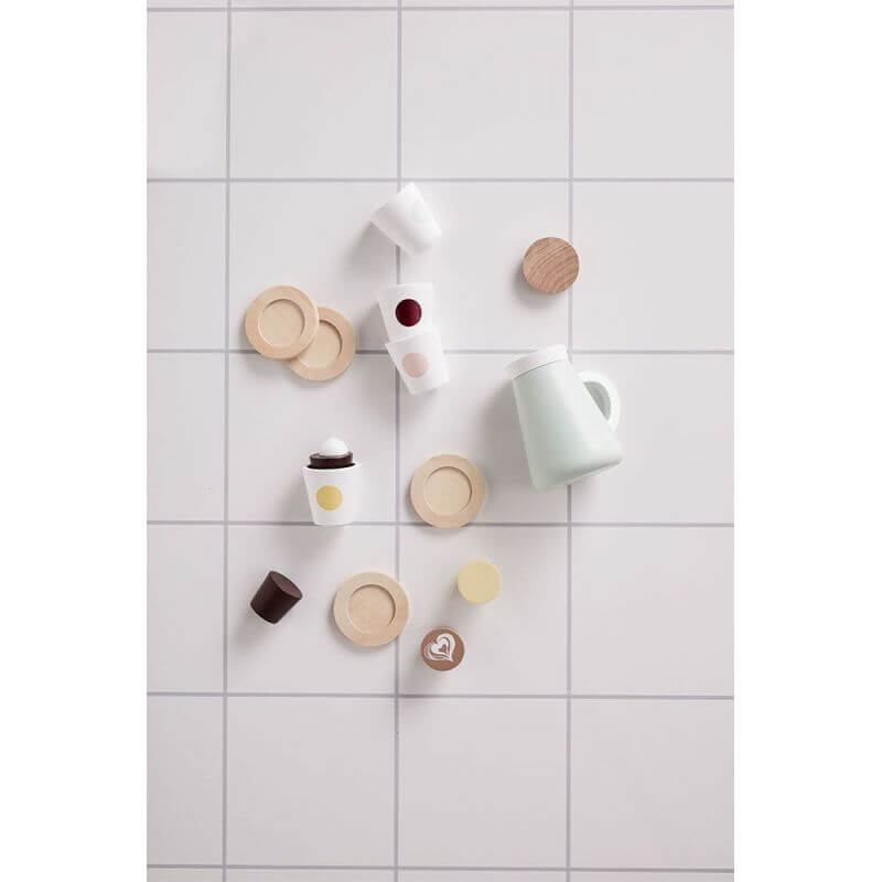 Kids Concept Fika Dryck, detta fina dryckesset i trä är perfekt för när barnen vill duka upp för fikastund för familjen eller kanske dockorna och gosedjuren.
