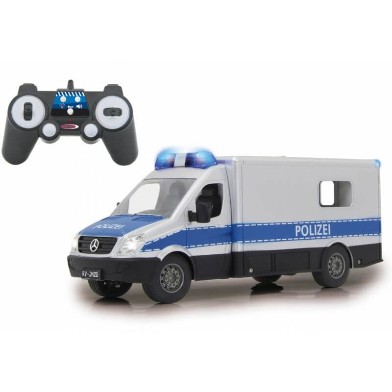 Radiostyrd Polisbuss Mercedes Sprinter 1:16 - 2,4 GHz, en superrolig leksaks för alla barn som tycker om att leka polis. Med denna häftiga och stora radiostyrda polisbuss med mängder av roliga ljus- och ljudfunktioner kan barnen nu jaga tjuvar som aldrig förr! Bland annat har polisbussen en tuta, lampor, öppningsbara dörrar, tysk polissiren som går att stänga av samt så ger den ifrån sig realistiska ljud vid start av motor och vid acceleration.