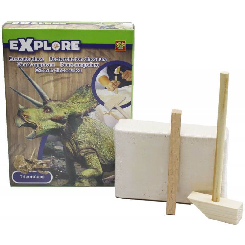 SES Excavate Dinosaurie Kranium Utgrävningskit, gräv fram ett kranium (huvud) ur gipsblocket. I gipsblocket gömmer det sig antingen ett kranium av Tyrannosaurus Rex, Triceratops eller Velociraptor.