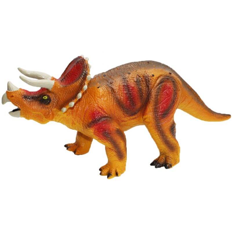 Leksaksdinosaurie i mjukt gummi i form av en Triceratops, en fin dinosaurie till barnens dinosaurielek. Fördelen med mjukt gummi är att den tål barnens lekar, både utomhus och inomhus. Dinosauriefiguren är i fina färger som brunt,beige, ljusbrun mm. Triceratops är en av de mest kända dinosaurierna som någonsin har levt och ser även väldigt häftig ut med sina horn och den stora benkragen. Den levde för ca 65 miljoner år sedan i Nordamerika.