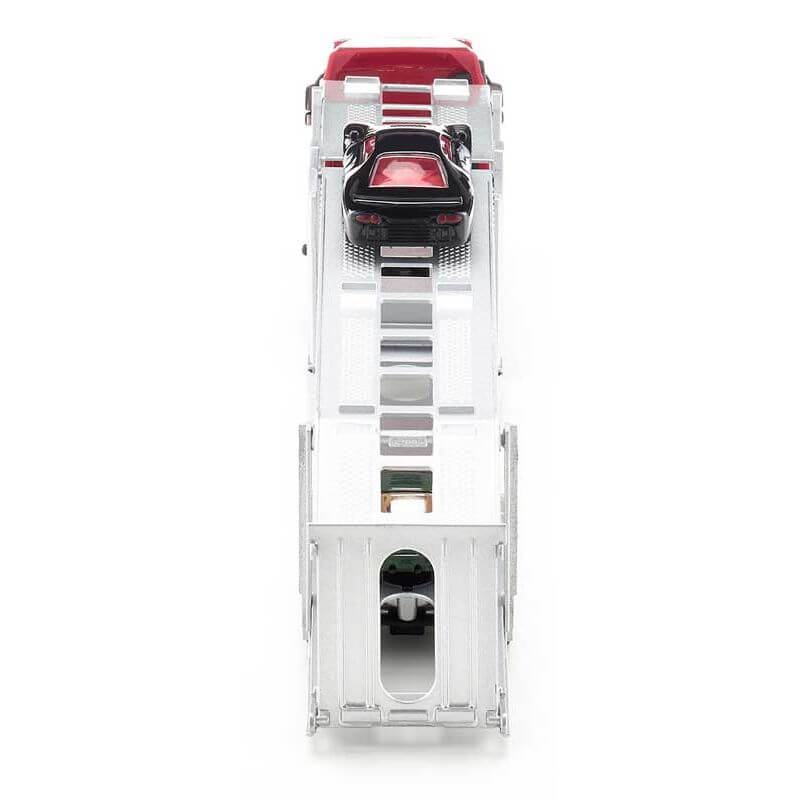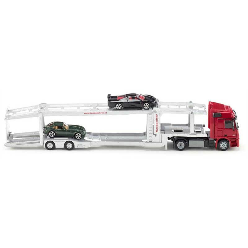 Siku Biltransport med 2 Bilar 3934, ett superroligt paket till barnen med en stor lastbil med transportflak och två fina bilar. Nu kan barnen lasta på bilar och andra roliga saker på transporten och köra runt med. Flaket går både att stänga och fälla ner. Man kan även fäller ner hela översta våningen så att bilar enkelt kan köras upp och ner. Skala: 1:50. Längd: 40 cm.