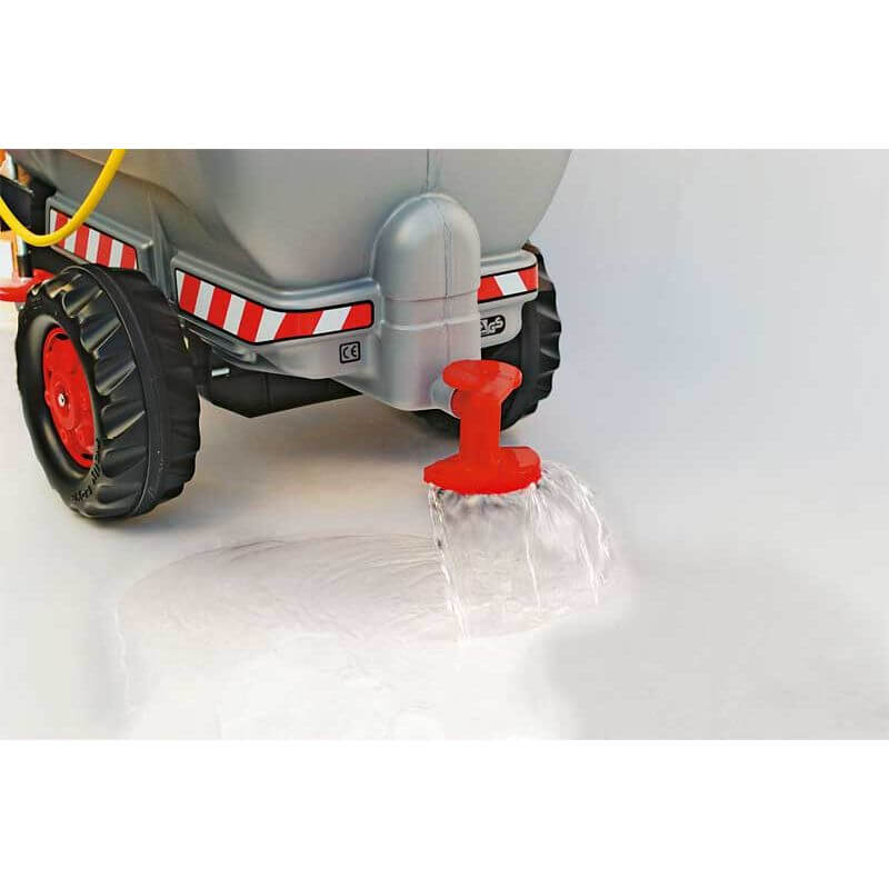 Man kan fylla den med vatten och leka att det är gödsel eller hjälpa till och vattna blommorna där hemma. Det är ett tvåaxlat släp med både sprutmunstycke och en tapp där bak, kan fyllas upp till 30 liter.