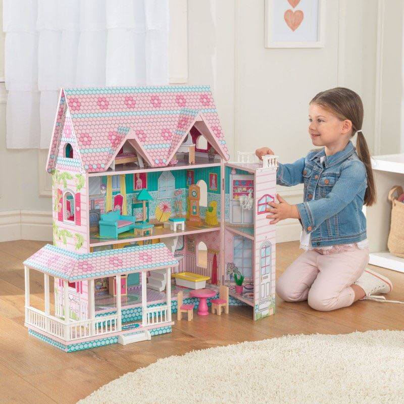 KidKraft Dockskåp Abbey Manor är ett riktigt fin dockhus med tak och fasad som går att öppna och stänga. I huset gömmer sig tre våningar och hela fem rum att leka och ha kul i. Balkongen på tredje våningen ger dockorna en fantastisk utsikt att njuta av.