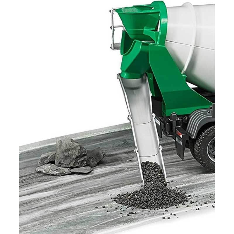 Cementbehållaren kan man fylla med, vatten, sand, jord eller något annat roligt. Sedan kan man tömma ut innehållet genom rännan där bak, precis som på riktigt.