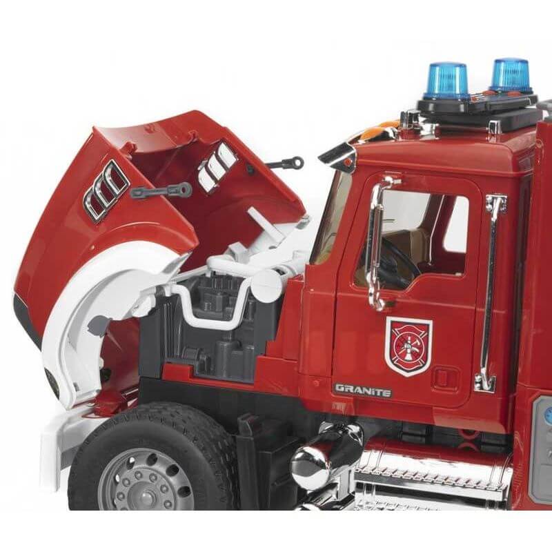 Bruder Lastbil MACK Granite Brandbil Lastbil med Vattenpump 02821, en perfekt leksak för den unga hjälten! Brandslangen kan spruta vatten på riktigt.