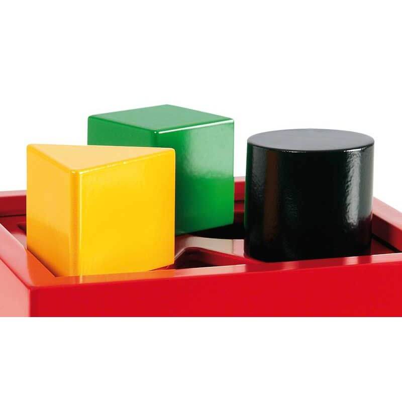 Plocklådan i fin röd färg bjuder på många timmars underhållning, Det medföljer 6 st klossar, 2 av varje form som är kub, cylinder och triangel.