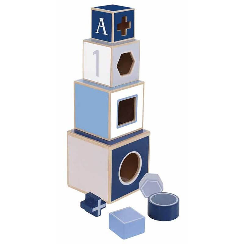 I leksetet ingår fyra stycken träkuber i olika storlekar, de går i mjuka blå nyanser och på vissa av dem finns en bokstav eller siffra att öva på. Det ingår även fyra olika geometriska figurer, kub, hexagon, cylinder och ett kryss som man placerar i de olika lådorna genom de utskurna hålen. Det gäller att hitta rätt hål till rätt figur annars kommer de inte att passa. Denna leksak kommer att utveckla barnens motorik och koordinationsförmågan mellan hand och öga på ett roligt sätt medans de leker. Man kan även passa på att öva på bokstäver, siffror och de olika formernas namn. Detta är helt enkelt en mångsidig och riktigt rolig leksak som kommer sysselsätta många barn i timmar.