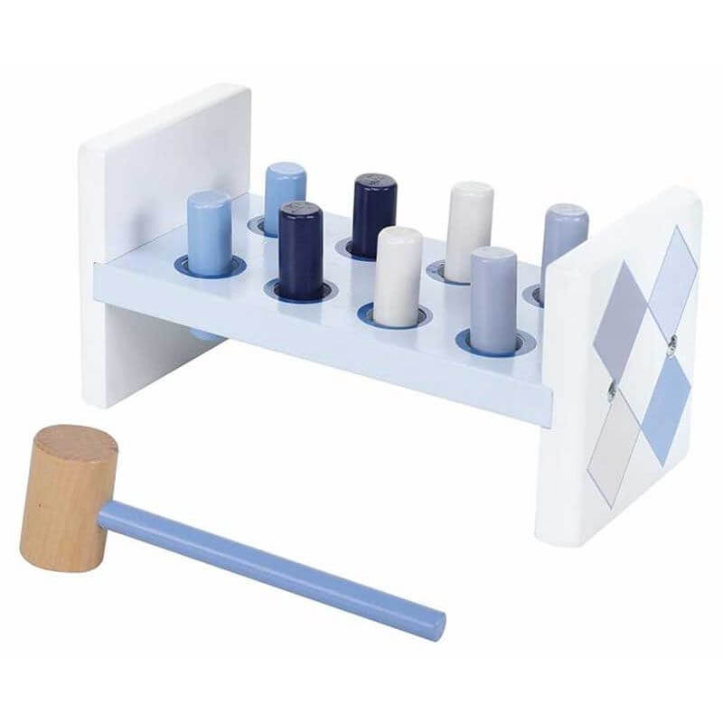 Bultbräda av trä för barn Blå, en klassisk bultbräda som går i mjuka vita och blå nyanser. Detta är en mycket rolig leksak som ger barn möjlighet att träna sin koordination mellan öga och hand samtidigt som de leker och har roligt. Banka ner de 8 bultarna med hammaren som medföljer, när alla bultarna har bankats ner är det bara att vända på brädan för att börja om. Man kan hålla sig sysselsatt i timmar med den här roliga leksaken och det allra bästa är ju att man får banka precis hur hårt man vill!