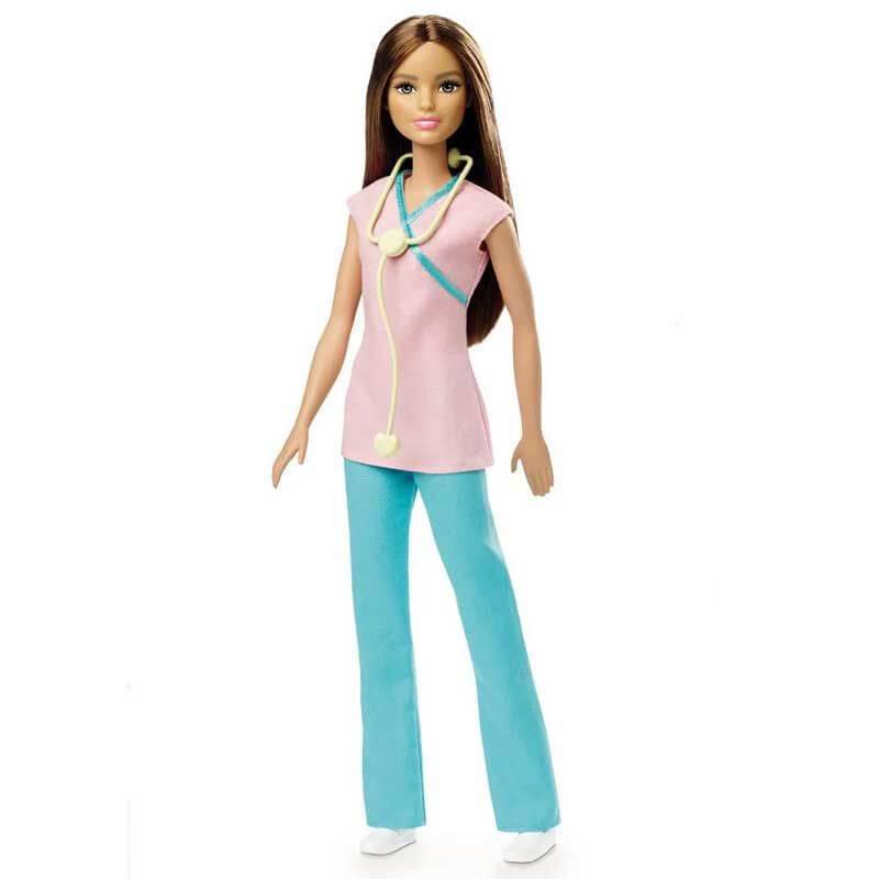Barbie Sjuksköterska Karriärdocka, nu är Barbie en sjuksköterska och vårdar patienter. Barbie gillar att testa nya yrken och att ta hand om patienter är något som hon tycker om. I detta set ingår också et stetoskop. Höjd: 29 cm.