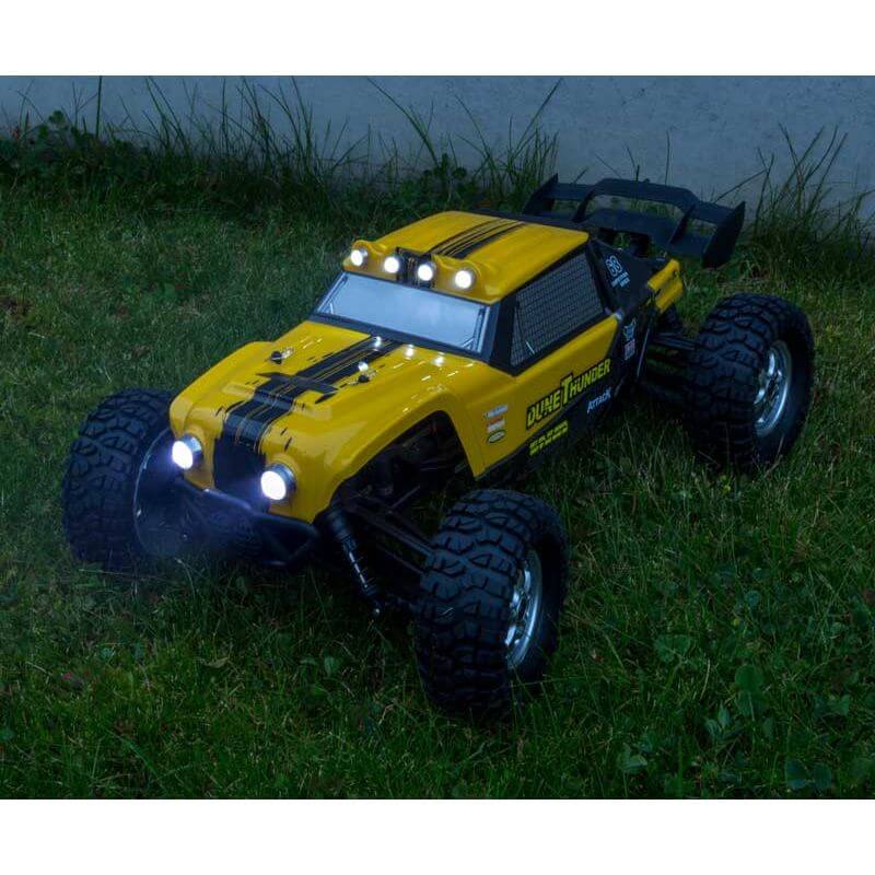 Bilen har även LED ljus på taket och i fronten, så man kan köra i mörker :). Med en toppfart på 35 km/h, 4-hjulsdrift, snabb servo och 2.4 Ghz teknik så blir det en grym körupplevelse.