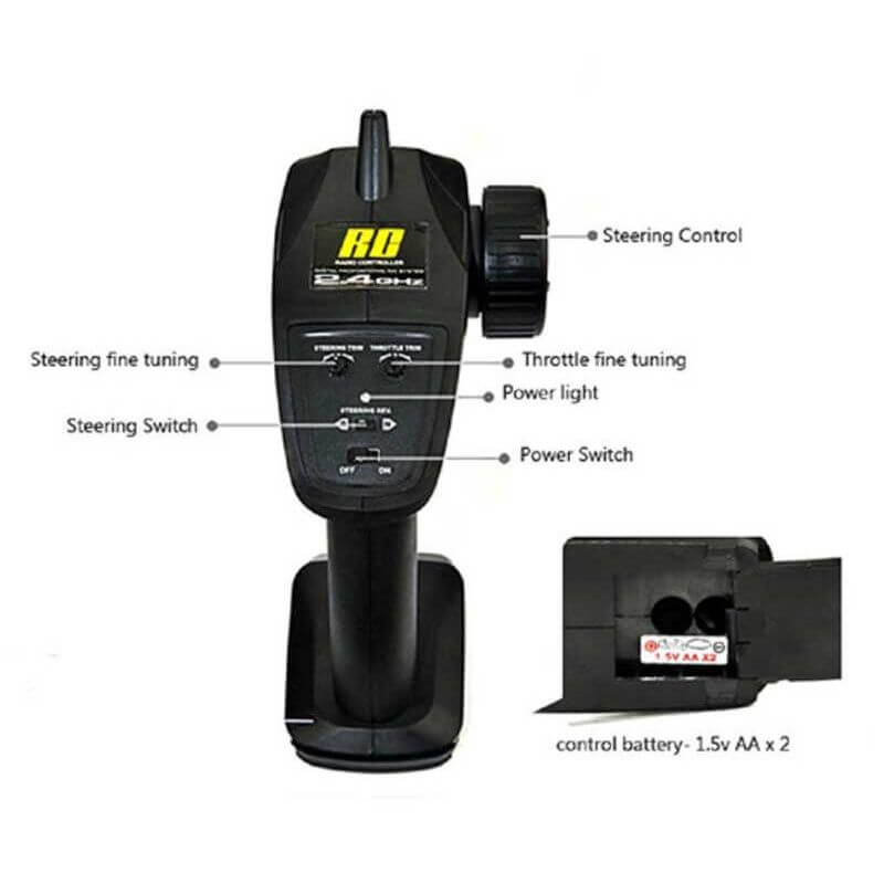 - Den radiostyrda bilen levereras med en enkel men ändå avancerad sändare / handkontroll där man kan göra finjusteringar som tex känslighet av styrning samt gas.