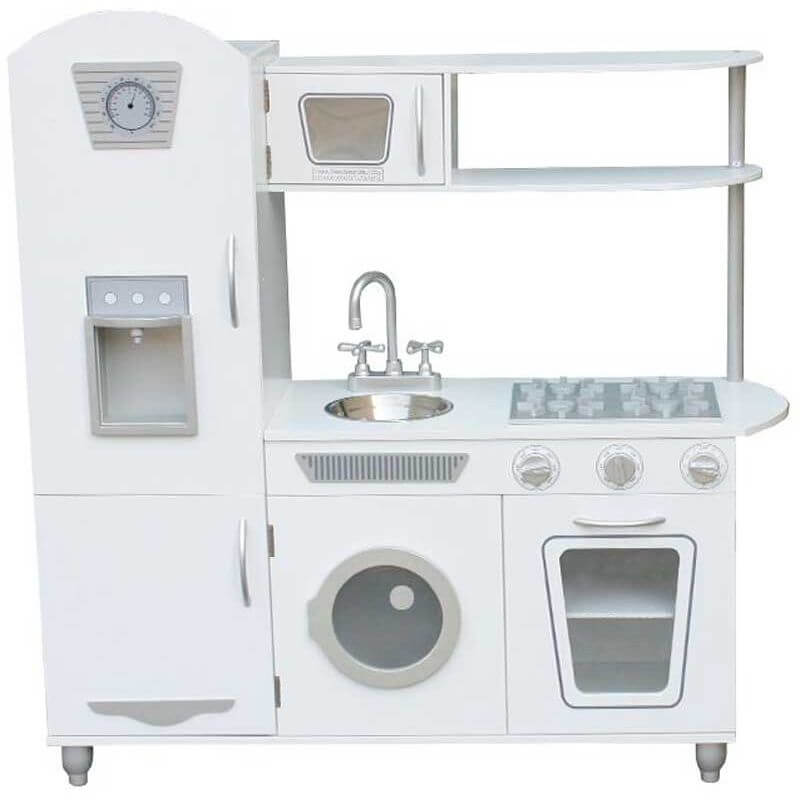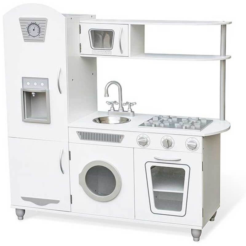 Woodi World Toy Leksakskök Jolie, ett underbart vitt kök. Detta härliga leksakskök har ett kylskåp med en lucka för bubbelvatten och is. Under kylskåpet är det ett skafferi för lite corn flakes, mjöl, bröd och andra matvaror. Det finns även en micro, en diskho i metall. Sedan finns det även en tvättmaskin, en ugn och så klart en spis. Spisen ska förställa en gasolspis med vridbara knappar. En förvaringshylla finns också där man kan ha glas, tallrikar, kokböcker eller något annat roligt.