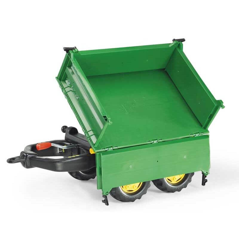 Rolly Toys Mega Trailer Grön, ett robust tvåaxlat släp som kan tippas både bakåt och åt båda sidor, lämmarna kan enkelt fällas ner för att kunna tömma det man lastat. Den har en koppling bak så att man kan koppla på ännu ett släp efter.