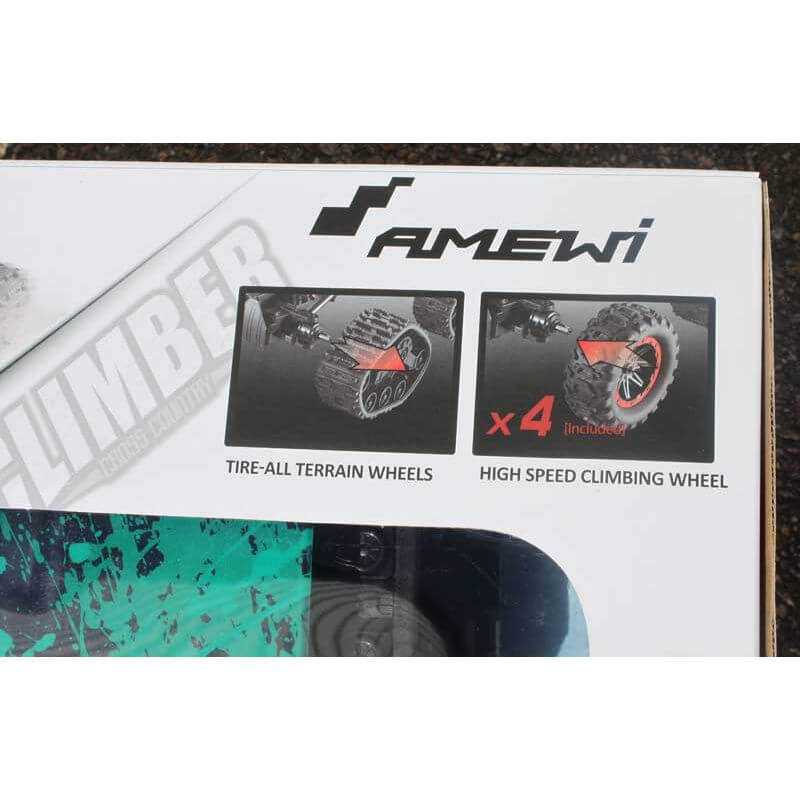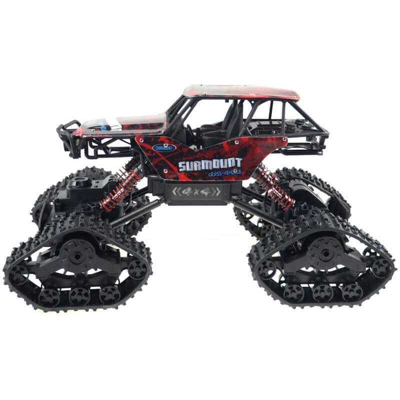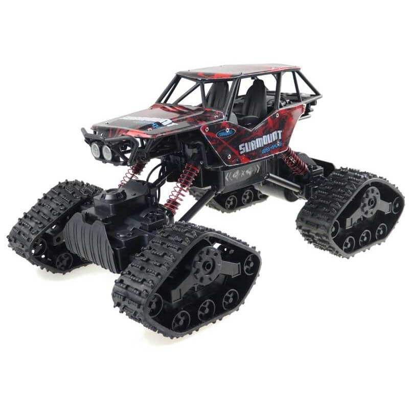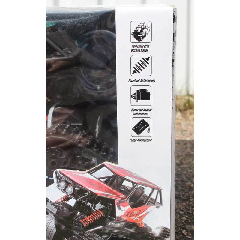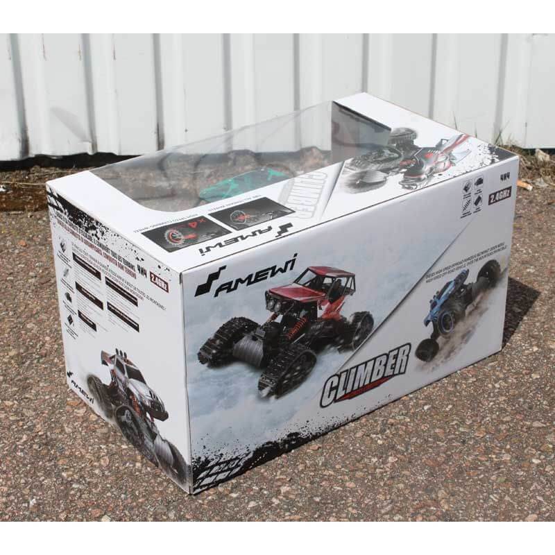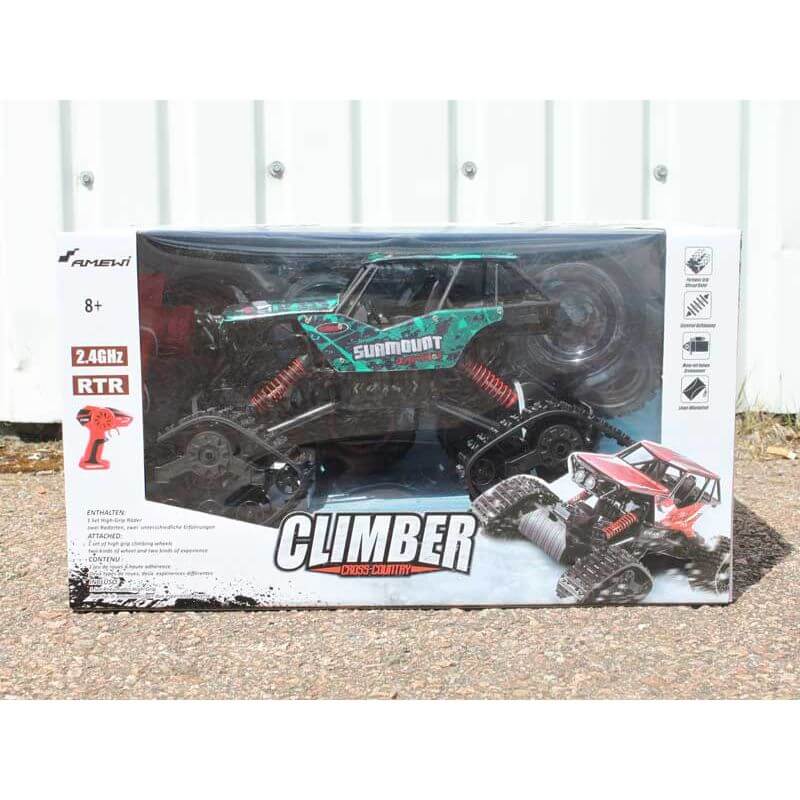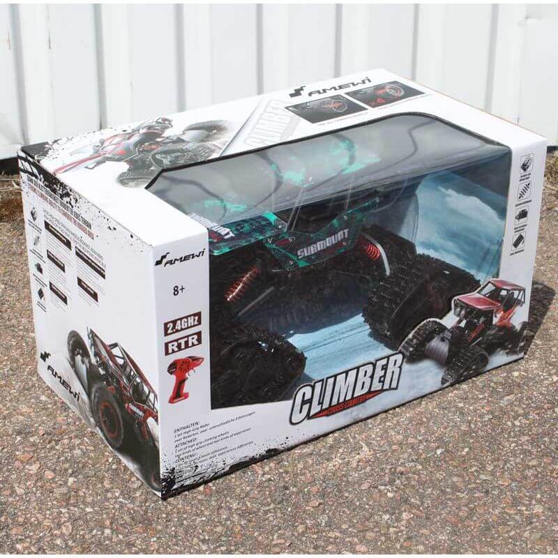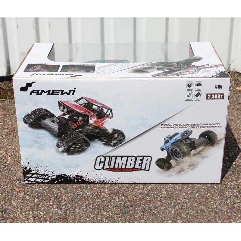 Amewi Radiostyrd bil Climber Crawler 4WD Röd, spana in den här riktigt tuffa bilen från Amewi, bilen är kraftigt byggd med två starka motorer, drivning på alla fyra hjul och otroligt tålig fjädring och chassi vilket gör den till en riktigt rolig bil att köra. Den klarar nästan all terräng, allt från sand, gräs, snö till grus och steniga sluttningar. Byt enkelt mellan band eller vanliga däck som ingår, beroende på vart och hur bilen ska köras. Tanken med bilen är att man ska "crawla sig fram", kravla sig fram och köra sakta över hinder, stenar, klippor med mera. Man kan köra i ca 8-15 minuter på en laddning, beroende på hur fort man gasar och beroende på terrängen.