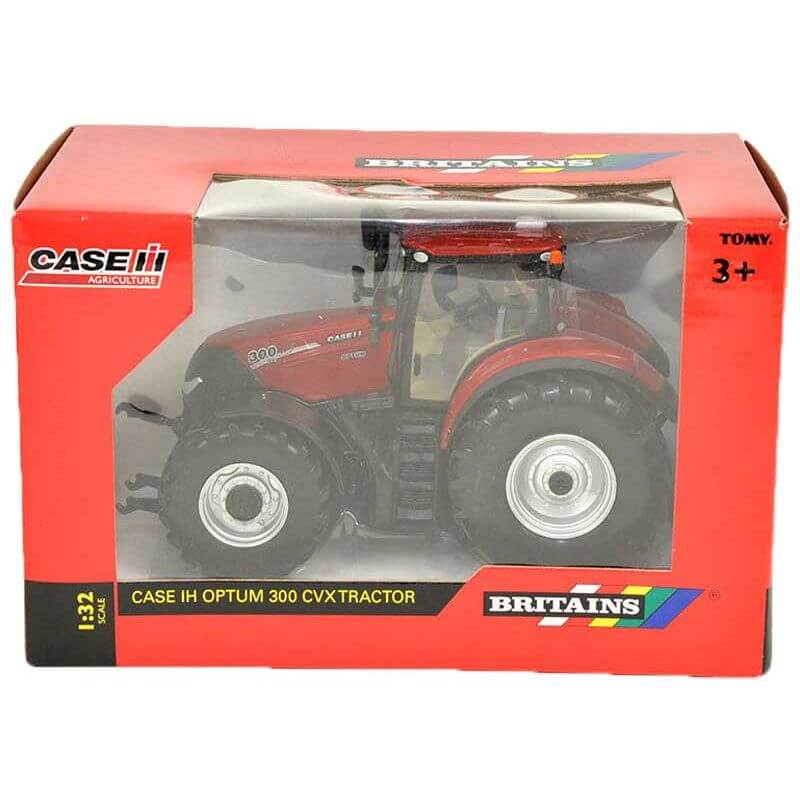 Leksakstraktor Britains Case Optum 300 CVX, en riktigt fin traktor för barnens lek, den här traktor är tuff och stark så den lämpar sig väl till alla möjliga olika uppgifter som kan förekomma på en gård. Koppla på ett släp och fyll det med gräs, jord, sand eller något annat roligt, kör ut foder till gårdens djur eller koppla på roliga redskap för att jobba på åkrarna. Skala: 1:32. Längd: 18 cm.