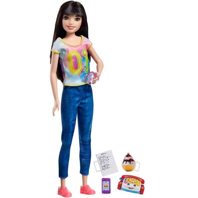 Barbie Skipper, dags att leka barnvakt. Barbie och Ken måste iväg på en weekend tillsammans. Då rycker barnvakten in, det ska nog gå bra. Hon har med sig en leksakstelefon och en god glass som hon och barnet kan äta. Barnvakten har en snygg T-Shirt, ett par sköna Jeans och rosa skor. Telefonen är med så klart, om Barbie och Ken skulle ringa och kolla hur det går. Nu får de ha en rolig helg tillsammans, barnvakten och barnet. Barbie och Ken, de får koppla av lite och bara ha det skönt.