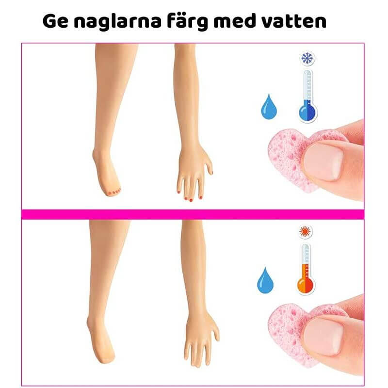 Barbie Spa med fotbad och manikyr, nu ska Barbie få njuta av ett härligt fotbad. Barbie kan efter en promenad vila sina fötter och pyssla om sig själv, med en skön rosa stol kan hon sitta och njuta en stund för sig själv.