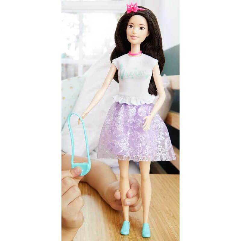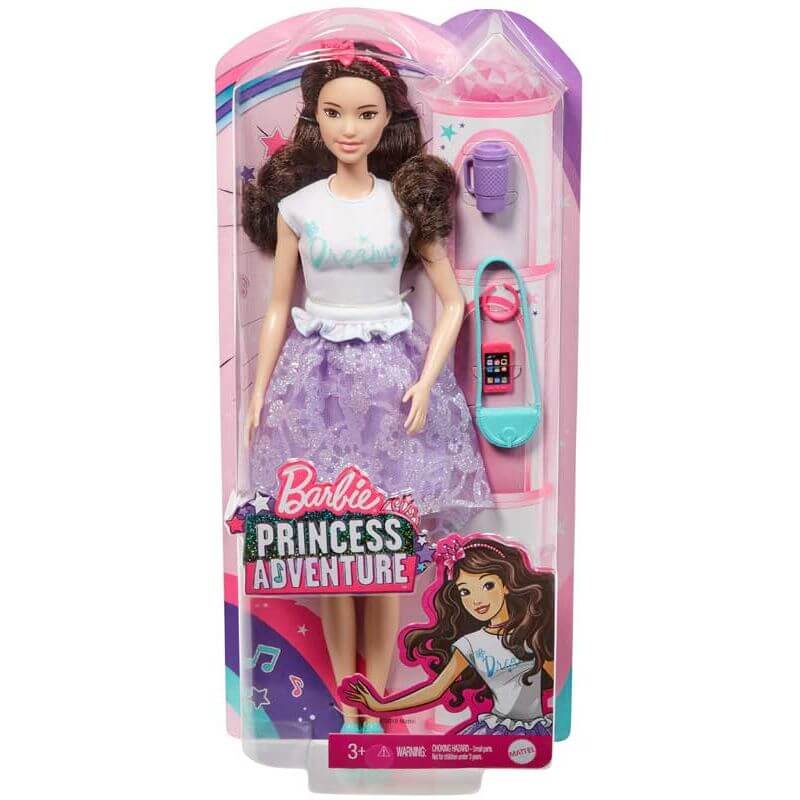 Barbie Princess Adventure Renee, Barbie som prinsessa i en vit topp med söta volanger nedtill och en helt underbar lila kjol till. Hon bär även ett par turkosa sneakers som matchar fint till väskan i samma färg samt ett rosa tiaradiadem med ett matchande halsband. Höjd: 29 cm.