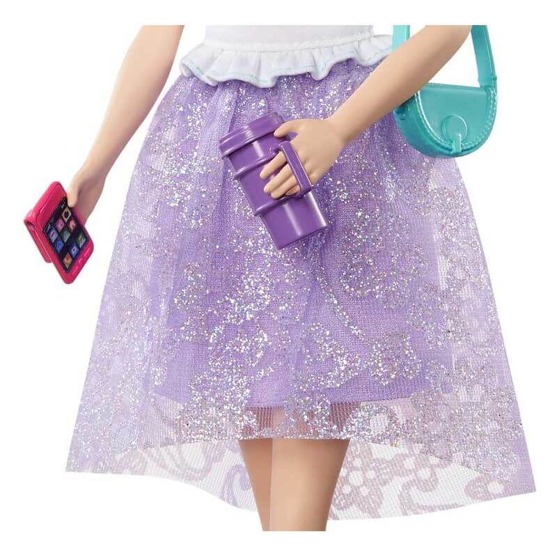 En riktigt fin docka som är redo för en heldag på stan med vännerna, hon bär med sig sin telefon och muggen som hon kan dricka kaffe eller te ur. En rolig dag väntar med shopping och en promenad i parken.
