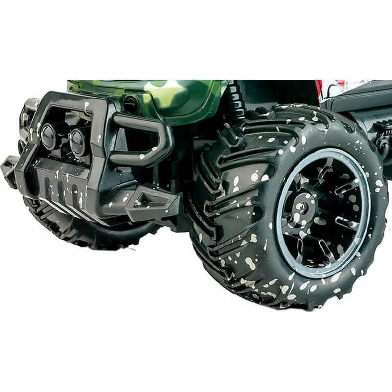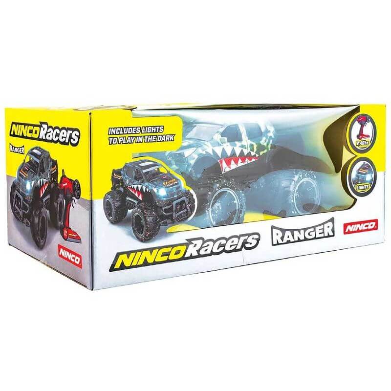 En jättehäftig radiostyrd bil Ranger från Ninco, en supertuff monstertruck med camouflage kaross och dekaler som liknar vassa tänder. Med tvåhjulsdrift, stora däck, stötfångare och en toppfart på 15 km/h så blir det ett roligt äventyr. Längd: 29 cm.