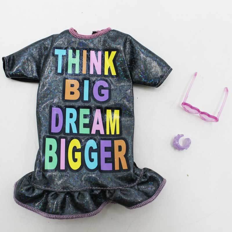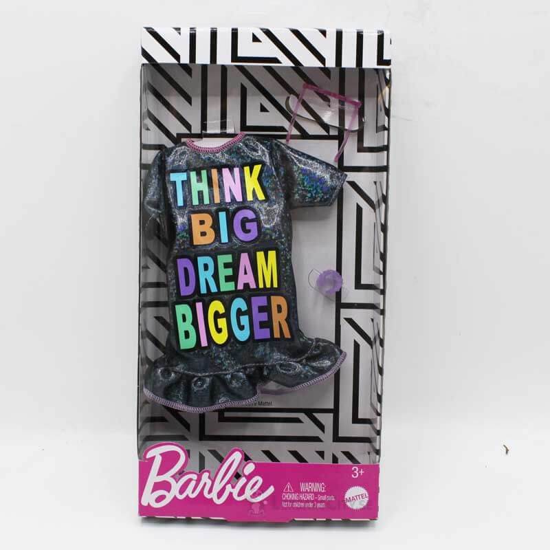 Barbie Fashion Klädset, ett härligt klädset till barnens Barbiedocka, i detta set ingår en riktigt cool klänning i svart med fint glitter och texten "Think big, dream bigger" på. Till klänningen ingår även et par lila solglasögon och ett matchande lila armband.