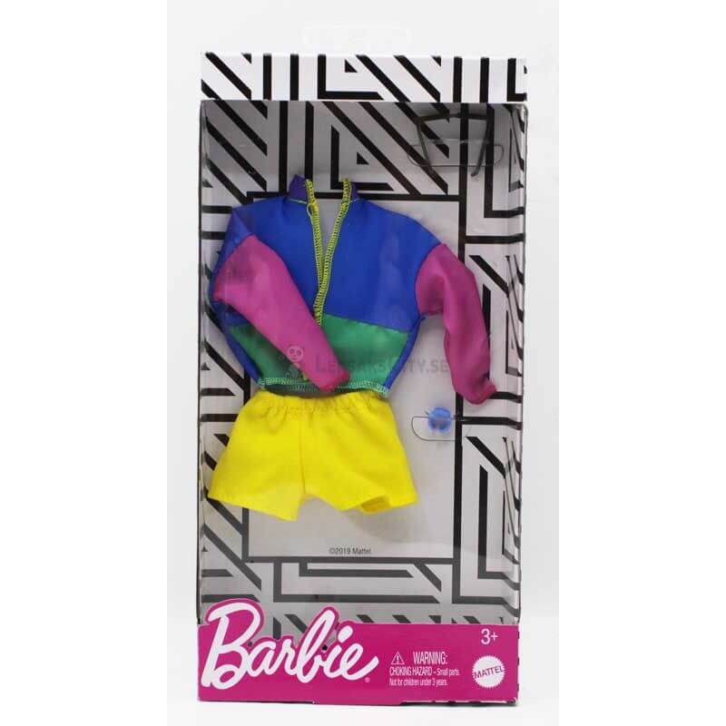 Barbie Fashion Klädset Sport, en sportig outfit för den lite mer aktiva Barbiedockan, klädsetet består av en färgglad löparjacka i blå, rosa, grön och lila. Till det ingår ett par gula shorts, en klocka och ett par solglasögon.