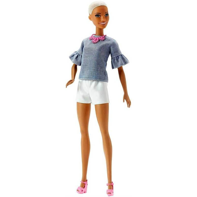 Barbiedocka Fashionistas Chic Chambray, en supertuff docka från Barbie fashionistas serien som självklart har stenkoll på de senaste trenderna precis som de andra fashionistasdockorna. Hon bär en blå blus i chambraytyg och med volanger i ärmarna, till det har hon ett par vita shorts i läderimitation och ett par rosa högklackade skor. Höjd: 29 cm