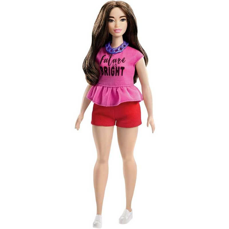 Barbiedocka Fashionistas Rosa Topp, en vacker Barbiedocka från Barbie fashionistas serien. Hon tycker mycket om kläder och att klä sig fint precis som de andra fashionistasdockorna, hon bär en rosa topp med volanger nedtill, på toppen står det "future is bright" och till den har hon ett par röda shorts, vita sneakers och ett lila halsband. Höjd: 29 cm