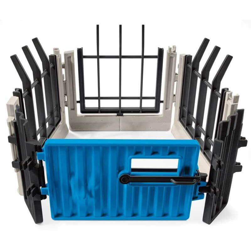 I förpackningen får man en grind, två anslutningsdelar och tre staktesektioner. klicka enkelt fast delarna i varandra för att bygga ihop hagen.