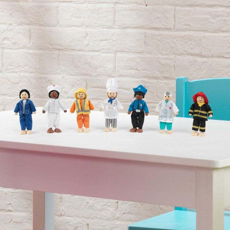 KidKraft Dockfamilj 7 st Professional, ett stort set med hela 7 dockor som barnen kan leka med i sitt dockhus där hemma. Detta set har inspiration från olika yrken och varje docka har sitt yrke med kläder utifrån det. Höjd: 12 cm.